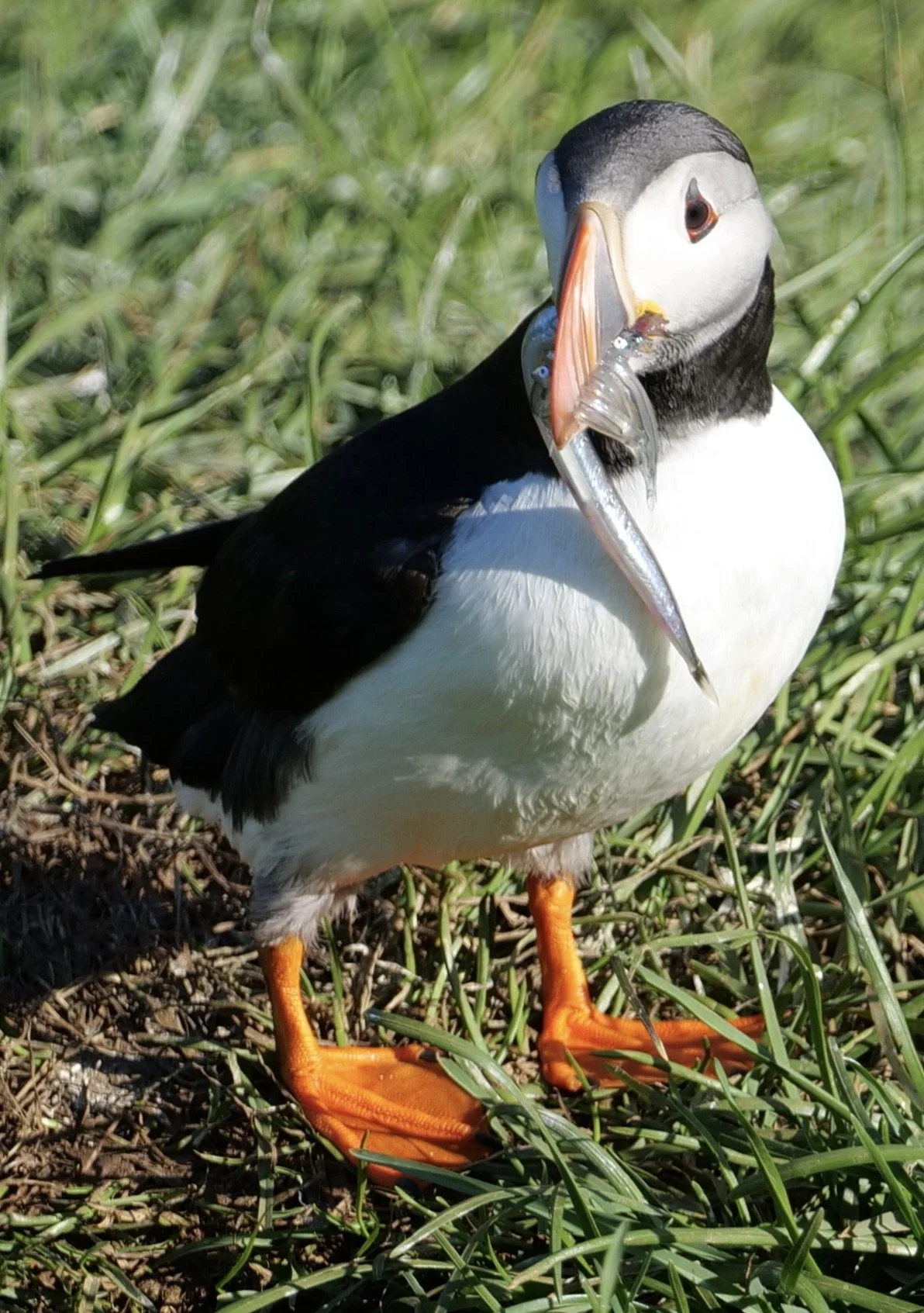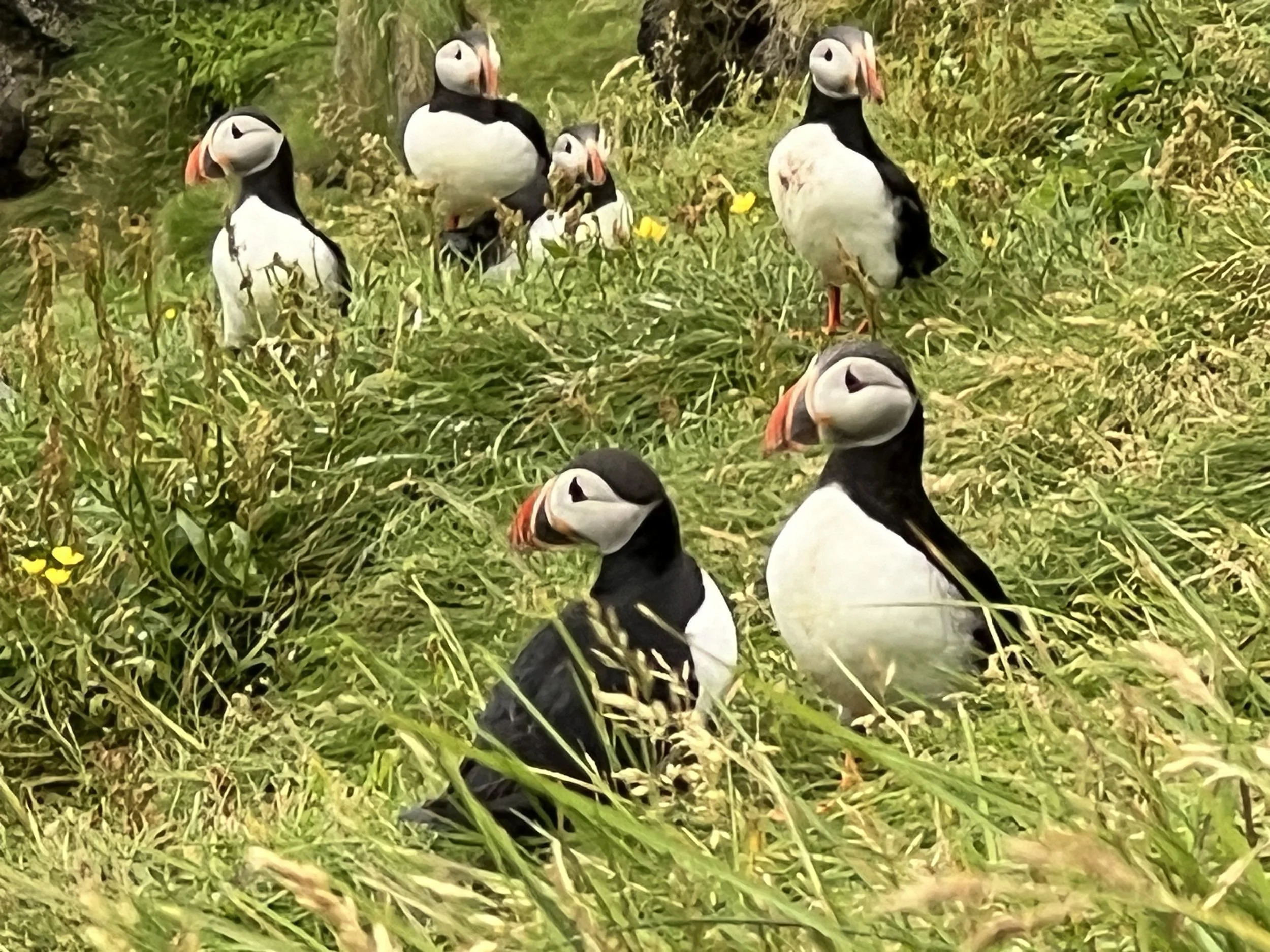 Of course, the other thing that Vestmannaeyjar is famous for is the puffins. Vestmannaeyjar houses the biggest puffin colony in the world and it is well worth going in the summer to see them. It is an 11km round trip to walk to the area where they are nesting, from the harbour. This can easily be done on foot as it’s a very easy walk along the side of the road to the other end of the island. On the ferry over to Vestmannæyjar you can either come with a car or by foot. It’s obviously much cheaper to go by foot but you do then need to walk everywhere (or get taxis/tours) once on the island. Heimaey isn’t big and to walk from the harbour to Stórhöfði (Great Cape) at the opposite, southernmost end of the island (where the puffins are) it is about 5.5km, so takes about an hour each way by foot, perhaps just under. I usually go there on foot, so have got quite used to the walk to Stórhöfði and will sometimes forego the road and walk the cliff path which is very beautiful but a much much longer walk. Once there, there is a green painted hut or ‘hide’ on the hillside where you can watch the puffins from within its shelter, but equally you can just sit on the tufted grassy hillside and watch them flying in and out of the burrows that are everywhere on the slopes.